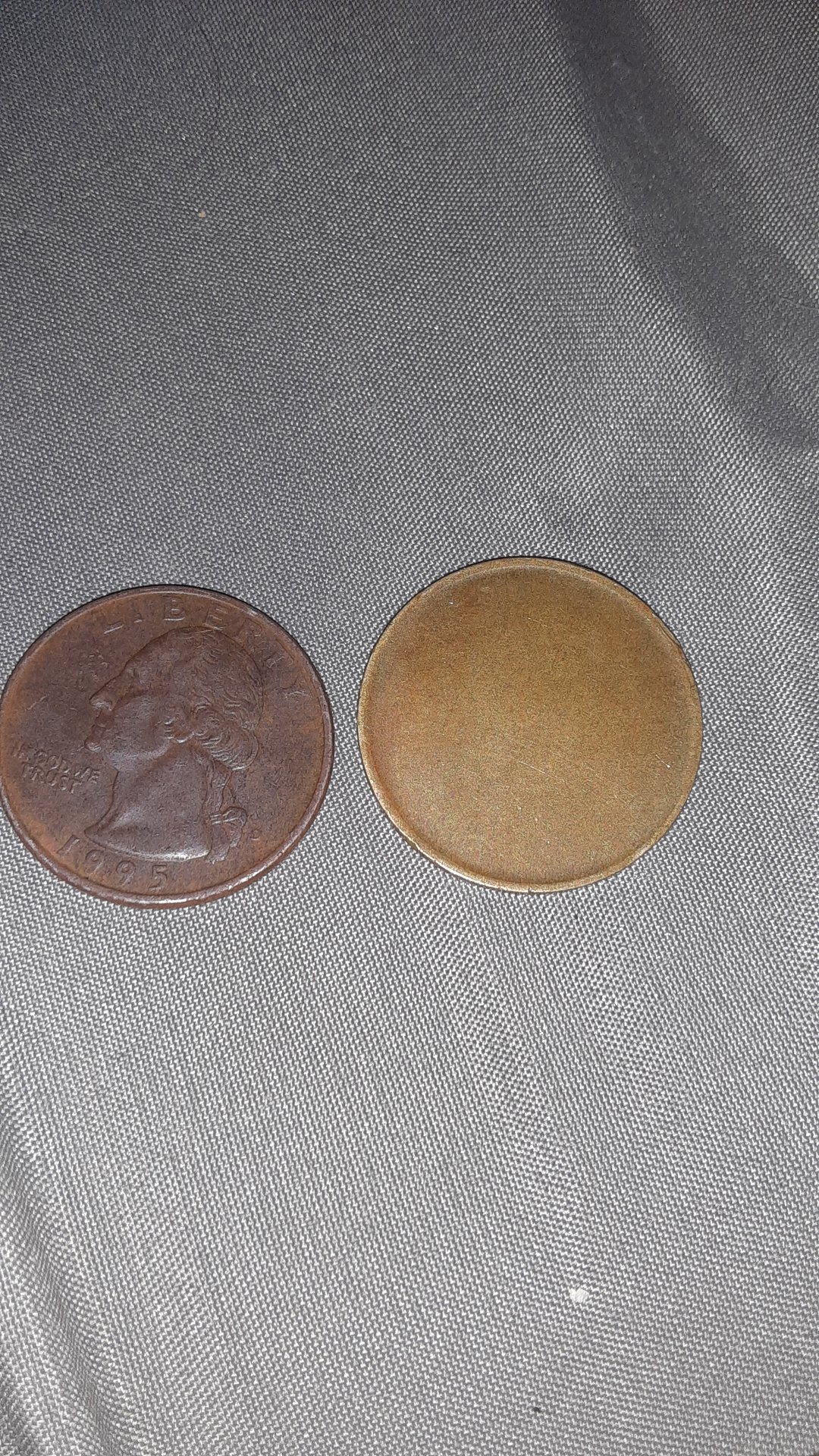 I don't know, slightly bigger than a quarter? The size is odd, foreign coin?