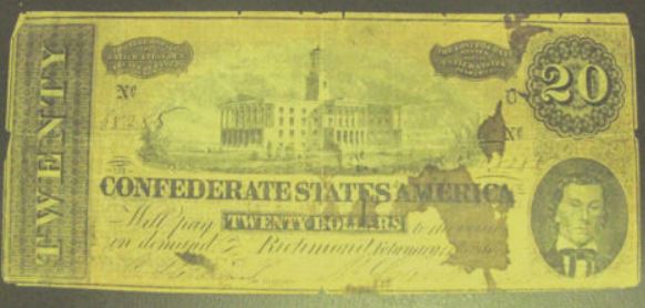 Here's a photo of the stained confederate note I bought today, and I will have to look for the "Japanese Government" invasion currency note that I brought into the school, and post later on..