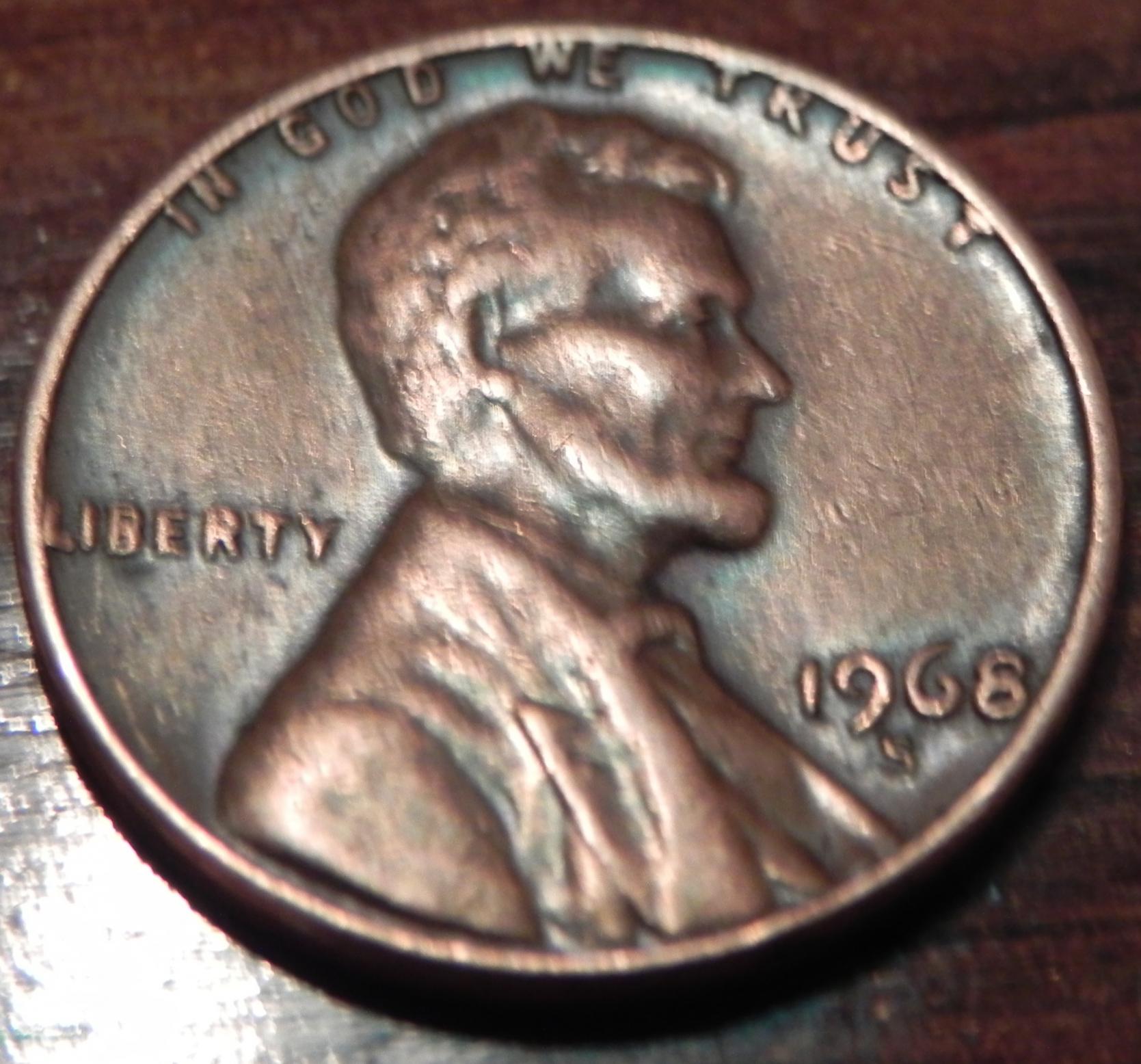 Searched for WAMs in a huge jar full of newer pennies. Found no WAMs, but found two interesting coins. One is my favorite, a 1968-S penny with blue toning around the bust and the rim (I think so):smile. Does the coin have blue toning, or is it paint? The second one is a 1997-D penny, that is maybe struck through grease. Is this a legit error?