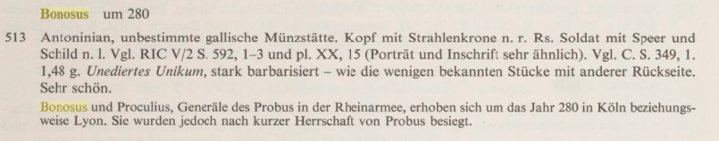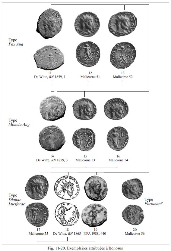 Reading this discussion: https://www.cointalk.com/threads/proculus-the-controversial-emperor.333696/#post-3377720 I read also something about the usurper Bonosus... According to Estiot, no coins of Bonosus exist. They are all local issues imitating Postumus, the wrong attribution is due to De Witte (1859). But during the years some coins was sold like Bonosus pieces: Hess Auction n. 41, 1969 (sold for 14.000 chf ) The majority of these type of coins came from the Malicorne hoard (see 1966, J. B. Giard http://www.persee.fr/doc/numi_0484-8942_1966_num_6_8_1114). Estiot studied the dies of all the known type and she summarized the results in this table: After the Estiot paper, 2014, (https://www.academia.edu/1378031/Pr...cules_Proculus_et_Bonosus_que_dit_la_monnaie_) only two others specimens related with this serie appeared: LEU web auction 1/2017 And this piece (now in my collection) that I found in a small lot of gallic coins: The Leu piece has a new type of reverse (ORIENS AVG), mine has tand of the two ex. n. 51-52 from Maliconrne hoard (see fig. 11-12-13 Estiot table). A great group of "barbarous radiates" with an interesting and fascinating numismatic history