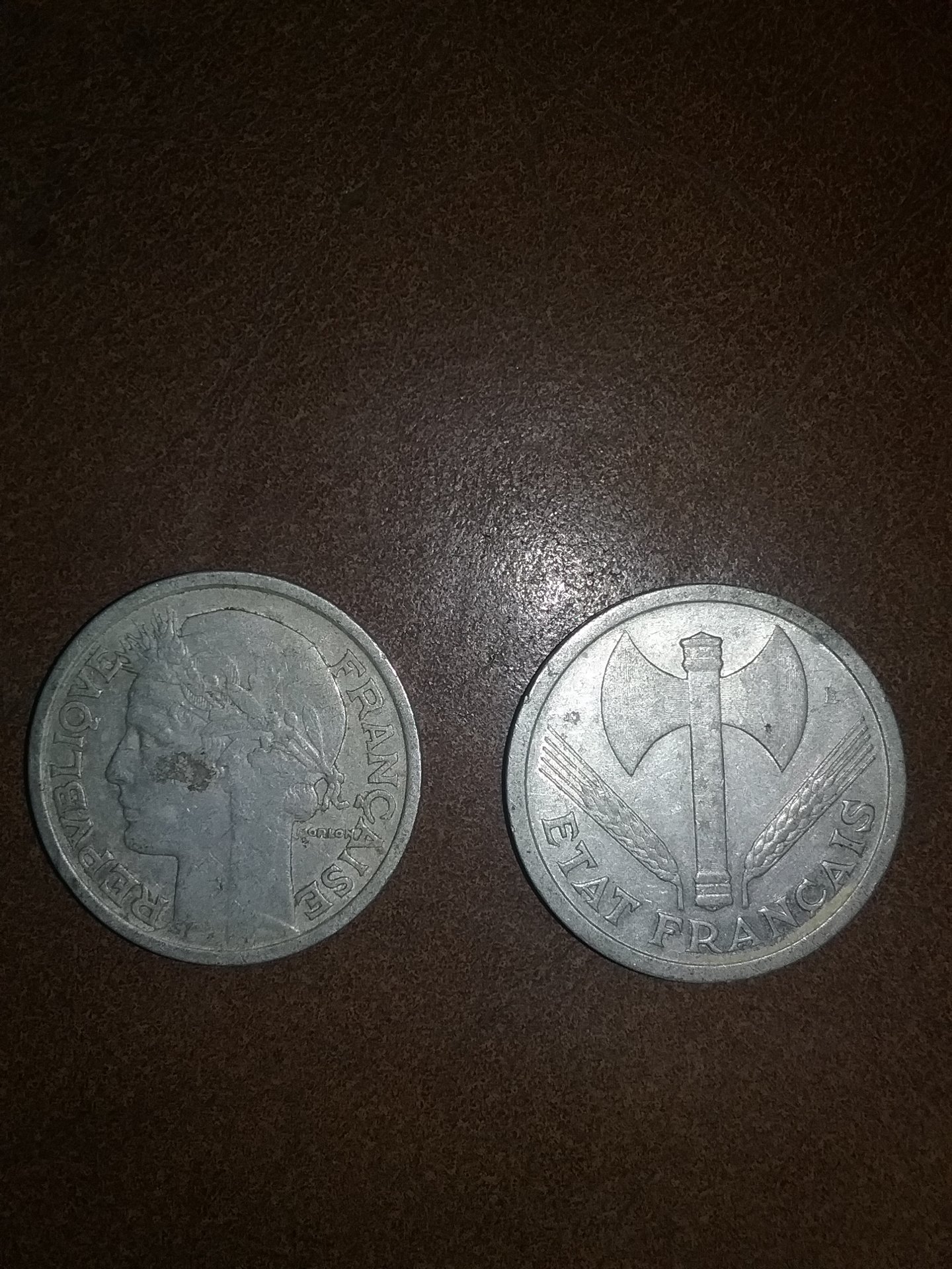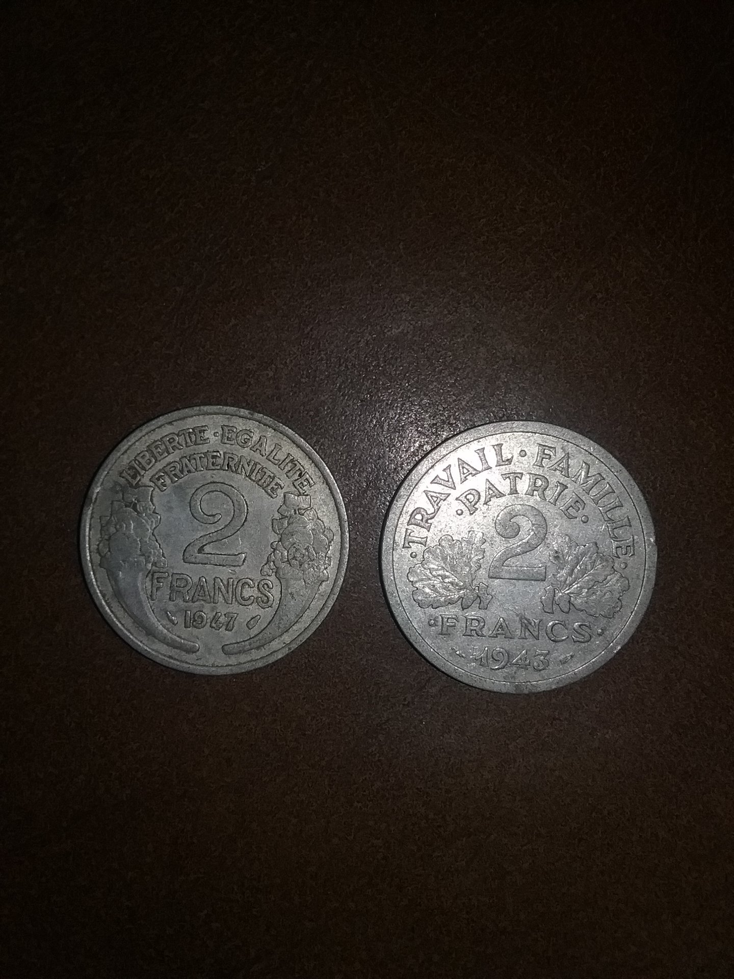 The french coins are from the post war French republic, and the 1943 is from the Vichy France government (German occcupation) The first piece appears to be a slug.