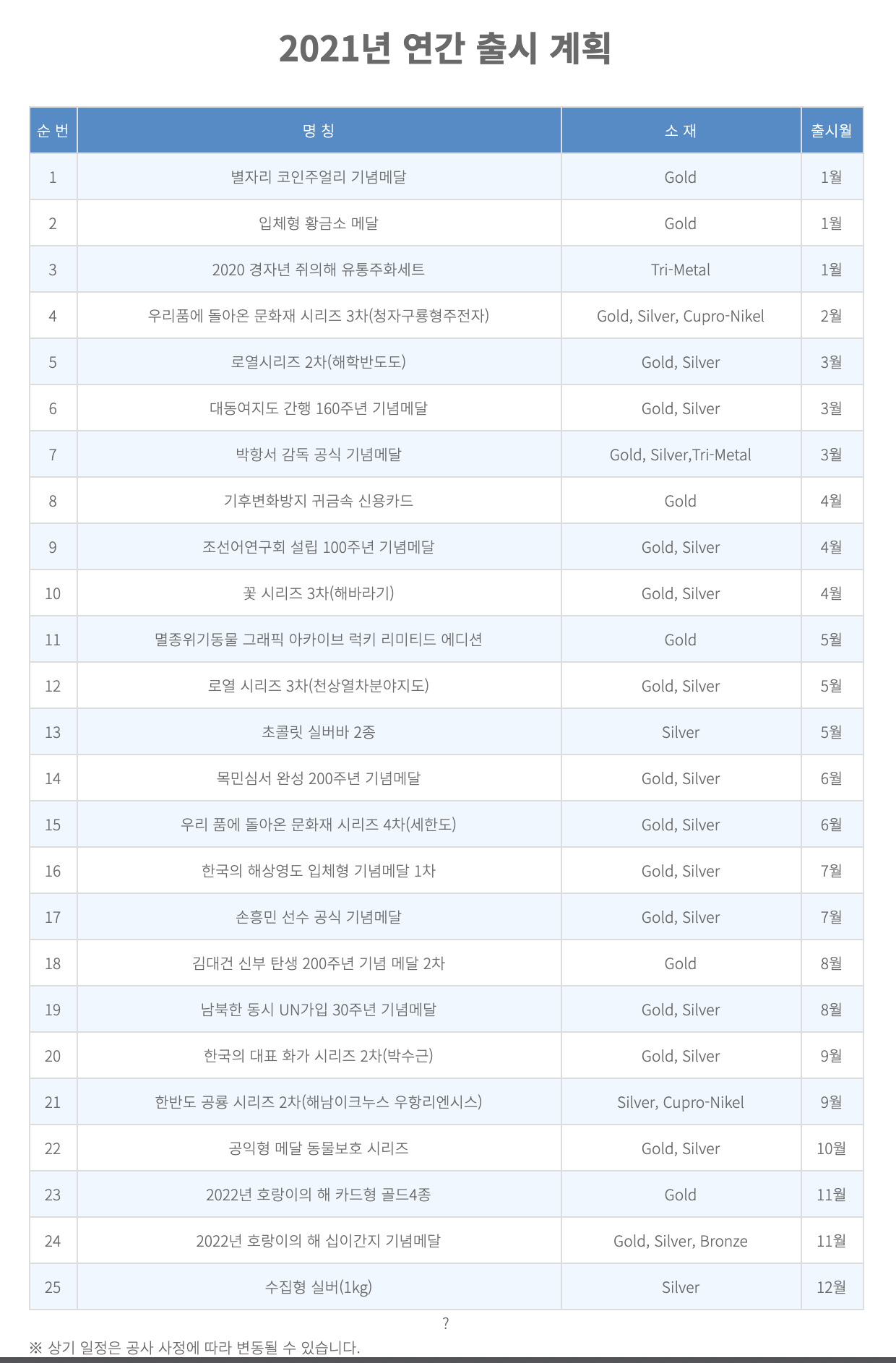 Here is the list of medals and coin sets that the KOMSCO Shopping Mall has planned for 2021 (attached at bottom, below). Nowhere to be seen on this list is the 2021 mint set! This is "concerning," since last year at this time, this same list for 2020 displayed both the 2020 Proof coin set (officially called the "70th Anniversary of the Bank of Korea Coin Set"), and the regular BOK Mint Set.