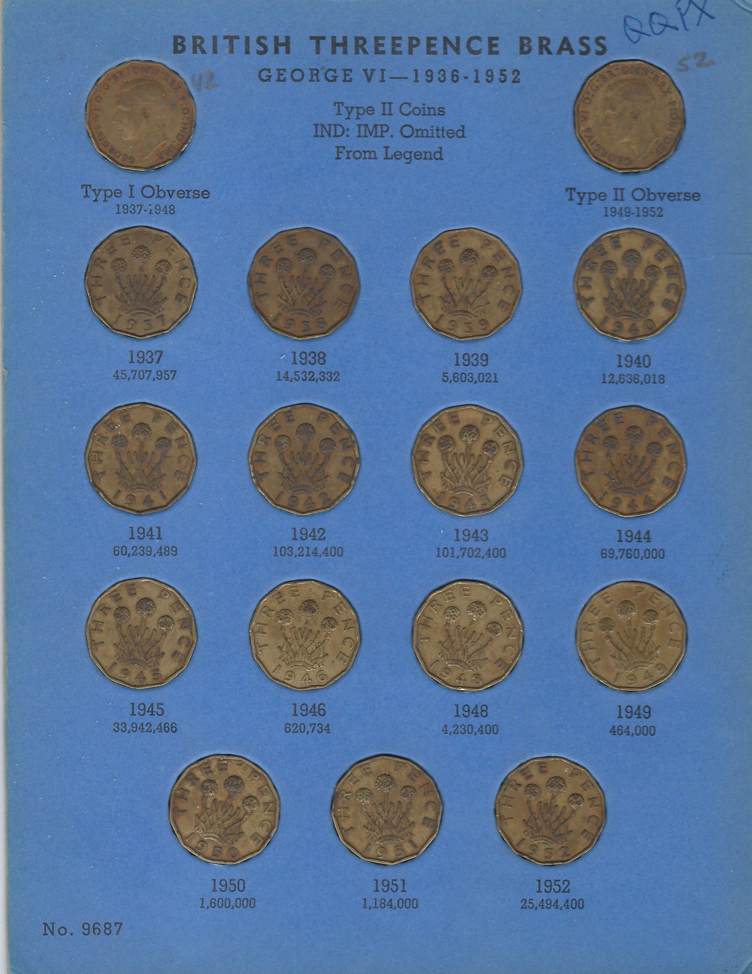 I just wanted to share this great deal I think I got. Someone was selling a Whitman folder with a complete set of brass British 3 pence coins from 1937 to 1965 on eBay. The set included the two rare dates, 1946 and 1949. I already have a set, but since I think I paid $24 for my 1949 and this whole set was $10, I couldn't let it go. Attached are photos of the first two pages. There are only 3 coins on the third page. And I do know that the series goes through 1967 with a proof in 1970, but this folder was obviously from when they were still being made.