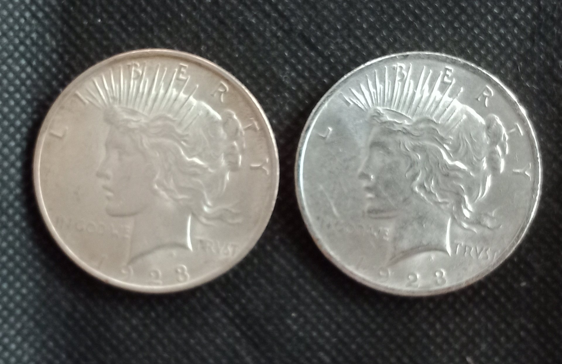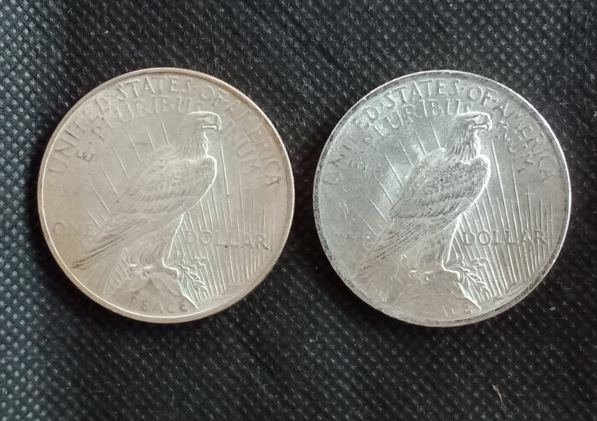 I picked up some "BU" Peace Dollars from one of the online retailers. Here's what I got: On the left is a Peace Dollar I picked up from the LCS a few years back from the junk silver tray. I got around 30 of these @ $16 each. On the right is what I got online, it just doesn't look right. If the coins have been cleaned and polished, are they still considered BU? I wouldn't think so. What do you think?