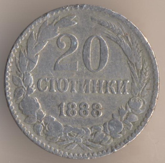 20 stotinkas 1888, copper-nickel, weight - 5 g., size - 21 mm, mintage - 5000000 pcs. Brussel Mint (Belgium).