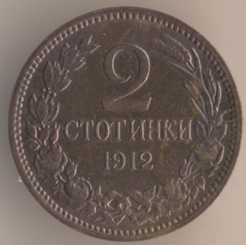 2 stotinkas 1912, bronze, weight - 2 g., size - 20 mm, mintage - 40000000 pcs. Engraver: A. Borrel. Kremnitz Mint.