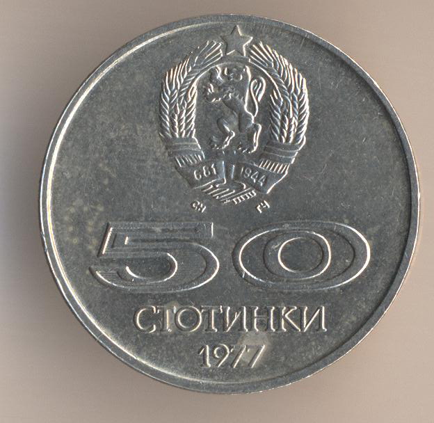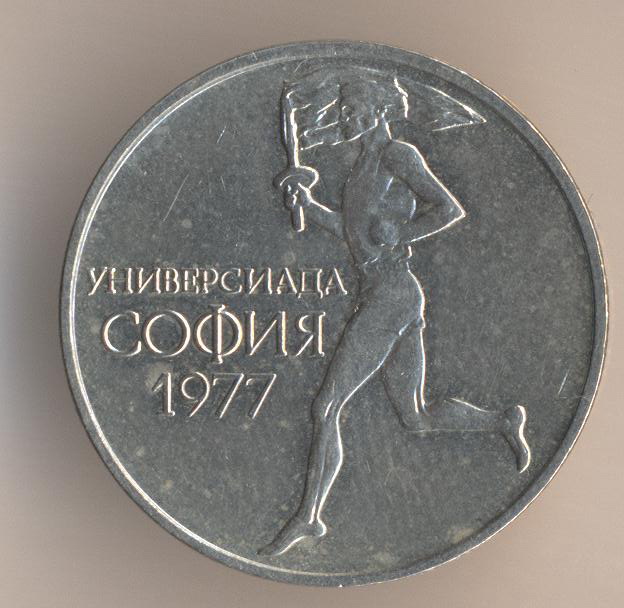 50 stotinkas 1977, copper-nickel, size - 23 mm, weight - 4 g., mintage - 2000000 pcs. Artistic design - Stefan Nenov & Georgi Chapkunov."University Games, Sofia (Bulgaria) 1977".