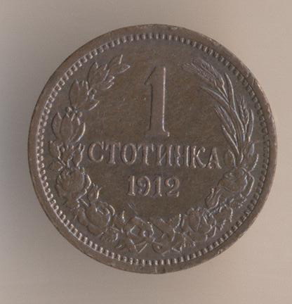 1 stotinka 1912, copper-tin-zinc alloy, weight - 1 g., size - 15 mm, mintage - 20000000 pcs, artistic design - unknown. Kremnitz Mint (Austro-Hungary).