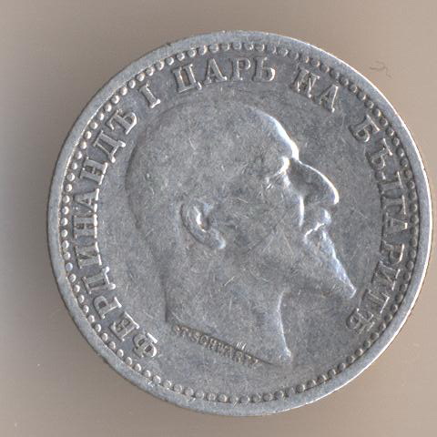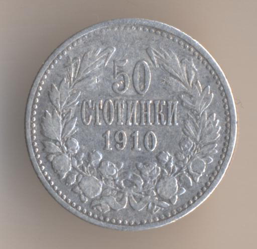 50 stotinkas 1910, silver .835, weight - 2,5 g., size - 18 mm, mintage - 400000 pcs, artistic design - Stefan Schwartz. Kremnitz Mint (Austro-Hungary).