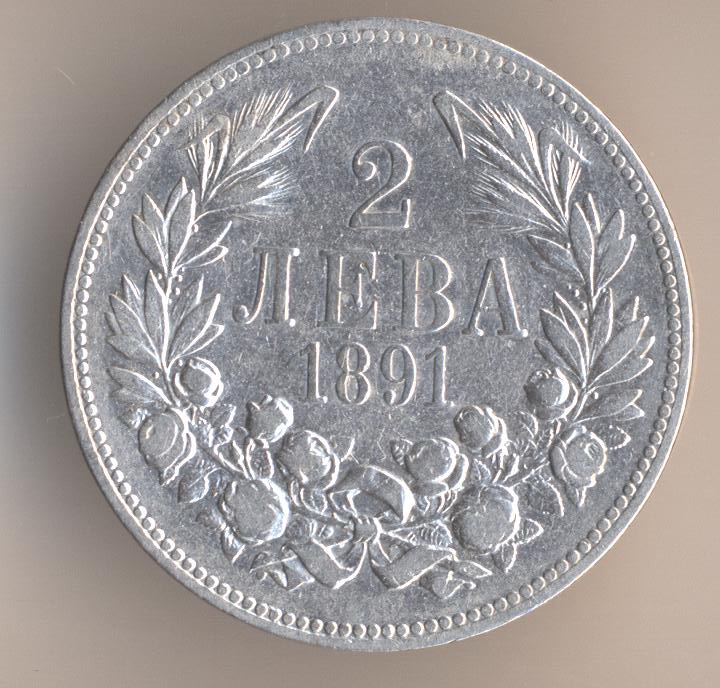 2 levs 1891, silver .835, weight - 10 g., size - 27 mm, mintage - 1500000 pcs, artistic design - Anton Sharf. Kremnitz Mint (Austro-Hungary).