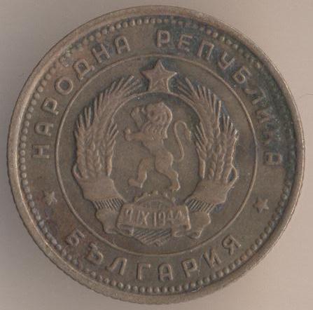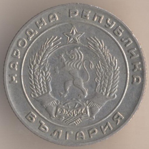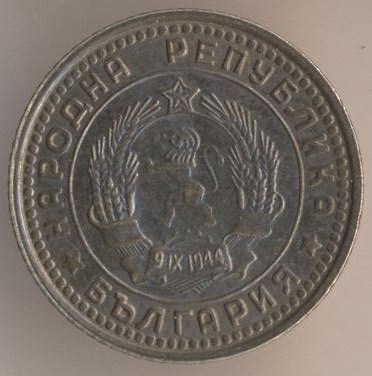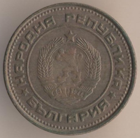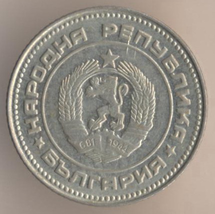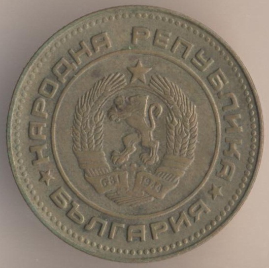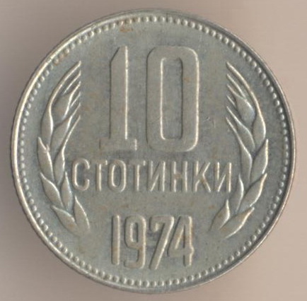 10 stotinkas 1974, copper-nickel, weight - 1,6 g., size - 17 mm, mintage - unknown. Minted in Sofia (Bulgaria). Such coins were released at 1974, 1979-80 and 1988-90. Type: "Two dates on arms: "681-1944".