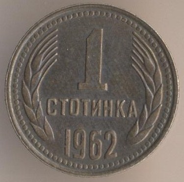 1 stotinka 1962, bronze alloy (brass), weight - 1 g., size - 15 mm, mintage - unknown. Minted in Sofia (Bulgaria). Such coins were released at 1962 and 1970. Type: "9/11/1944 on ribbon".