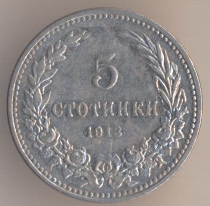 5 stotinkas 1913, copper-nickel, weight - 3 g., size - 17 mm, thickness - 1,5 mm., mintage - 20000000 pcs. Viena Mint (Austria).