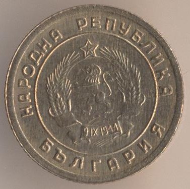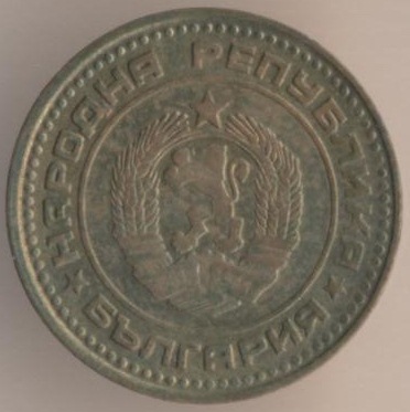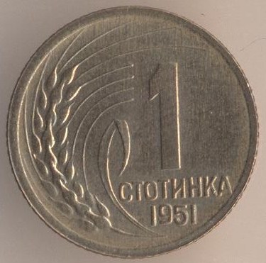 1 stotinka 1951, bronze alloy (brass), weight - 1 g., size - 15 mm, mintage - unknown. Minted in Leningrad (USSR) and Sofia (Bulgaria). Single release only.