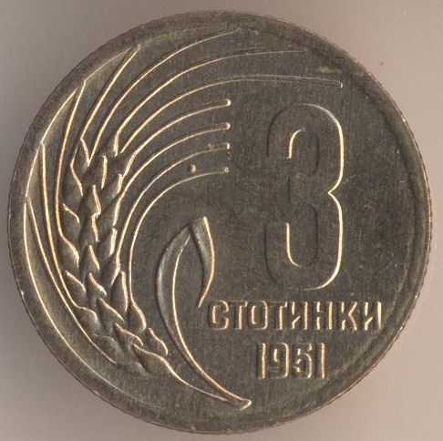 3 stotinkas 1951, bronze alloy (brass), weight - 2,4 g., size - 19 mm, mintage - unknown. Minted in Leningrad (USSR) and Sofia (Bulgaria). Single release only.