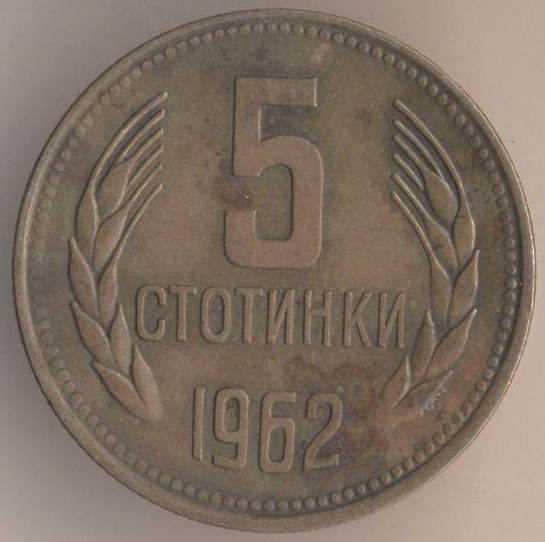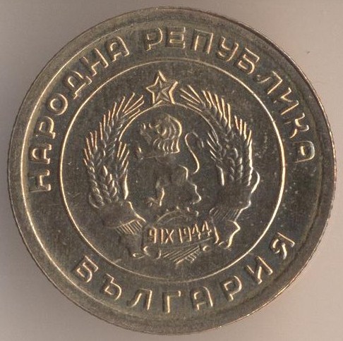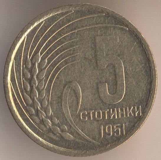 5 stotinkas 1951, bronze alloy (brass), weight - 3,1 g., size - 22 mm, mintage - unknown. Minted in Leningrad (USSR) and Sofia (Bulgaria). Single release only.