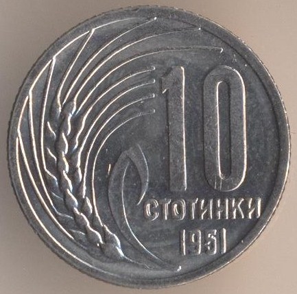 10 stotinkas 1951, copper-nickel, weight - 1,8 g., size - 17 mm, mintage - unknown. Minted in Leningrad (USSR) and Sofia (Bulgaria). Single release only.