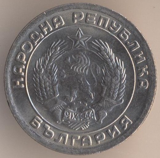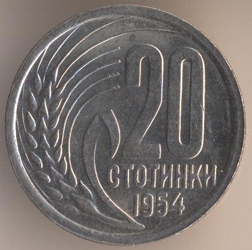 20 stotinkas 1954, copper-nickel, weight - 3 g., size - 21 mm, mintage - unknown. Minted in Sofia (Bulgaria). Price in Krause (F-VF-XF-Unc: $0,1-$o,25-$0,75-$1,5).