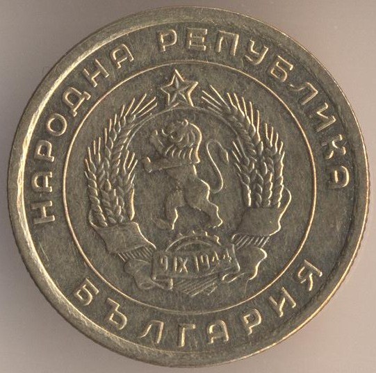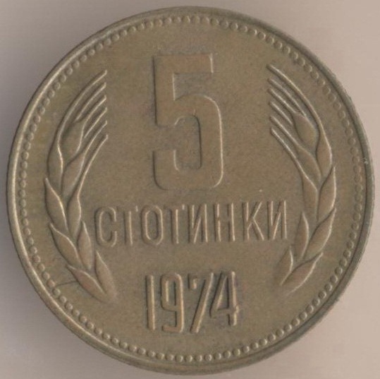 5 stotinkas 1974, bronze alloy (brass), weight - 3 g., size - 22 mm, mintage - unknown. Minted in Sofia (Bulgaria). Such coins were released at 1974, 1979-80 and 1988-90. Type: "Two dates on ribbon: "681-1944".