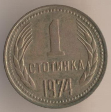 1 stotinka 1974, bronze alloy (brass), weight - 1 g., size - 15 mm, mintage - unknown. Minted in Sofia (Bulgaria). Such coins were released at 1974, 1979-81 and 1988-90. Type: "Two dates on ribbon: "681-1944".