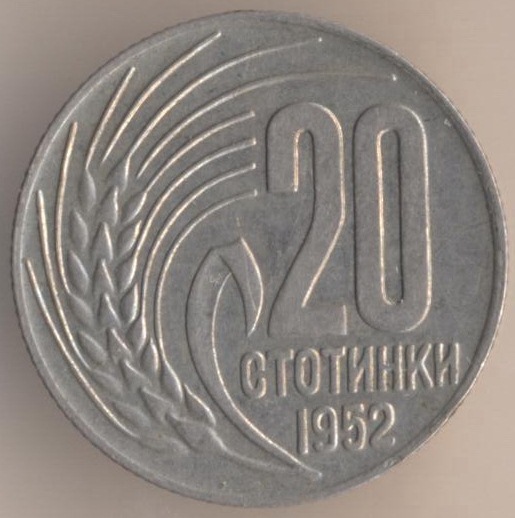 20 stotinkas 1952, copper-nickel, weight - 3 g., size - 21 mm, mintage - unknown. Minted in Sofia (Bulgaria). Price in Krause (F-VF-XF-Unc: $1-$2,5-$7,5-$20).