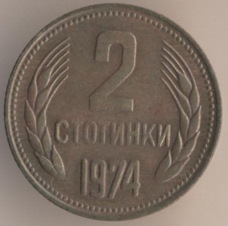 2 stotinkas 1974, bronze alloy (brass), weight - 2 g., size - 18 mm, mintage - unknown. Minted in Sofia (Bulgaria). Such coins were released at 1974, 1979-81 and 1988-90. Type: "Two dates on ribbon: "681-1944".