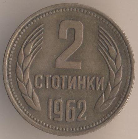 2 stotinkas 1962, bronze alloy (brass), weight - 2 g., size - 18 mm, mintage - unknown. Minted in Sofia (Bulgaria). Single release only. Type: "9/11/1944 on ribbon".