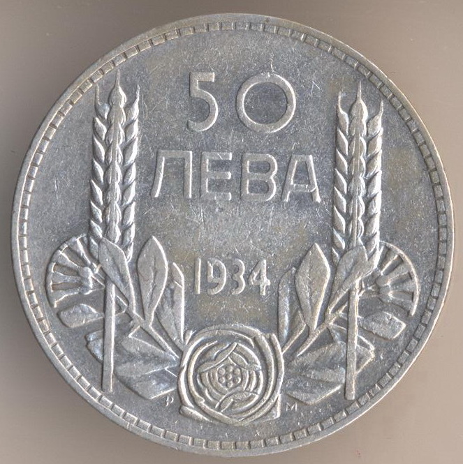 50 leva 1934, silver .500, weight - 10 g., size - 27 mm, mintage - 3000958 pcs. Engraver: Percival Metcalf. The single release only.