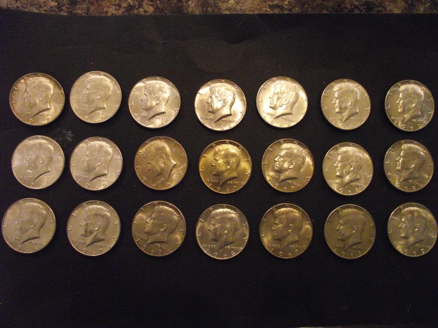 This contest is fairly simple, and everyone can participate. Simply estimate the melt value of the silver in the picture below one month from now (Saturday March 18th). You must have atleast 50 posts to participate, and have one week to make your guesses. Guesses will close Next Saturday the 25th of Feb. @ 5 P.M. I will check the current silver prices at 5 P.M. Saturday March 18th and announce a winner. The winner (whoever is closest) will win the 21 halves pictured. Please check previous posts, and ensure that your guess has atleast a 25 cent difference from anything posted. These are 40% Silver Halves btw. Good Luck, ~Jason Please do not edit your post after you have provided a guess (phdunay you are ok)