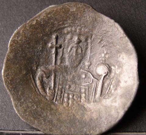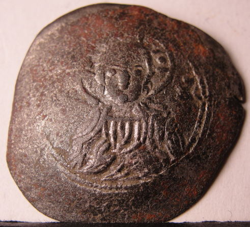 Byzantine Empire Manuel.. Billion Aspron Trachy.. Cup coin.. 1043- 1080..AD.. Ob. Christ on a throne facing. Rev..Bust of Manuel facing , crowned, wearing chiamys and holding a laberum.. 28mm x 3.67g..Silvered