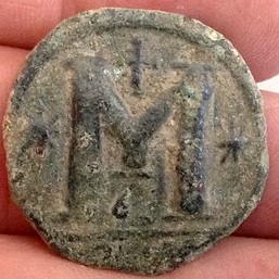 Here's another large coin, my pic's for some of my coins are missing... Anastasius l ..491- 518..AD.. Ob. Diademed dr. cuir. bust right.. Rev. Large M between two stars,cross above.. Sandy green patina.. Mint.. Constantiople Monster coin..35mm x 18.79g..
