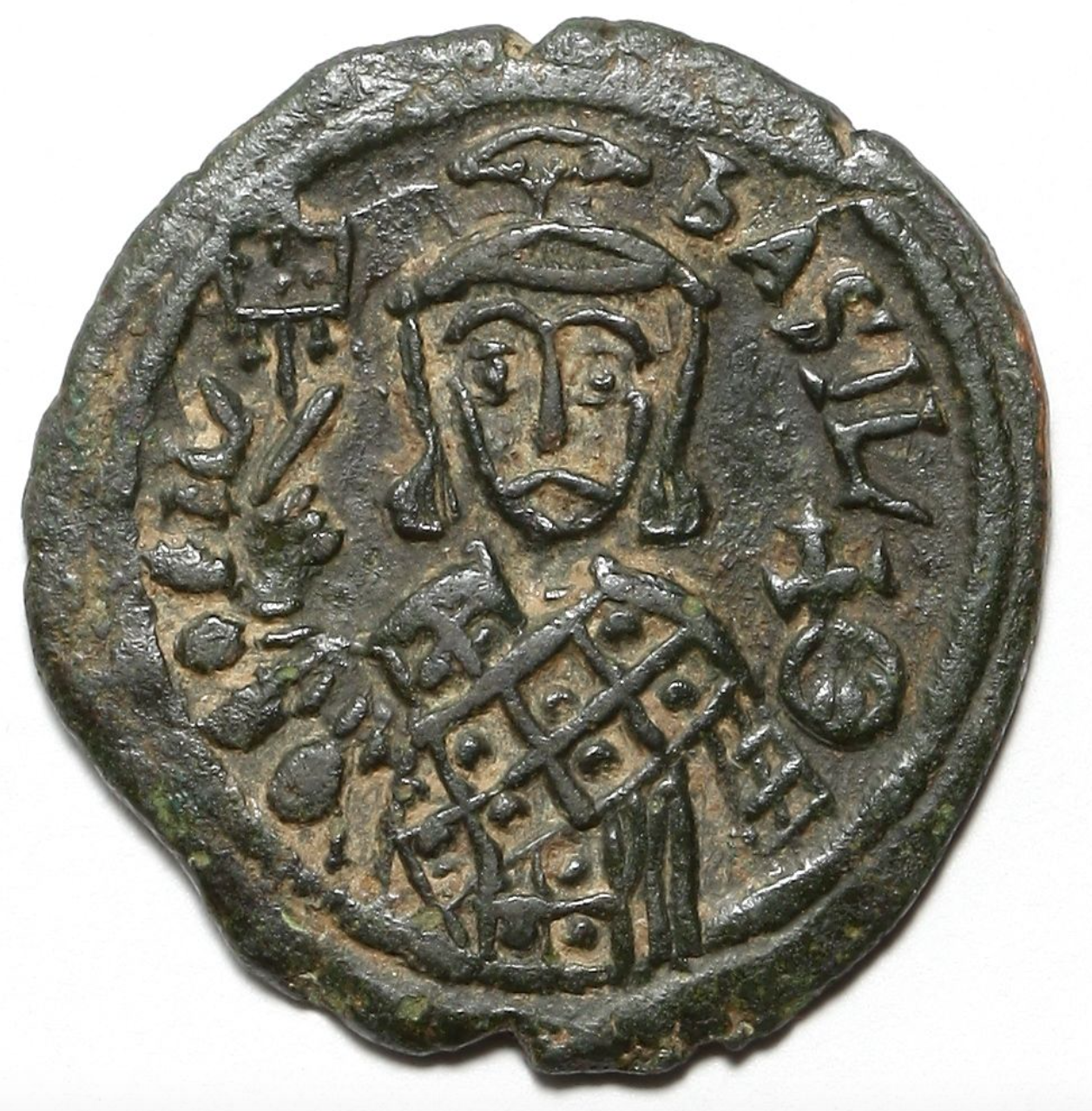 This was a gift a few years back ROMANUS III Follis OBVERSE: IC-XC to right and left of bust of Christ facing with nimbate cross behind head, square in each limb of nimbus cross, holding book of gospels, a dot in centre of dotted square on book REVERSE: IS-XS BAS-ILE BAS-ILE to left and right above and below cross with dots at the ends, on three steps Struck at Constantinople 1028-34AD 9.5g, 29mm SB 1823