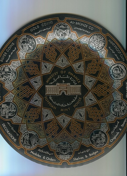 Cairo Mint Plate Being the national mint of any country is to be part of a very competitive business. Some mints are happy to just be part of their respective government. Other larger mints in this modern era are run like a business with the goal of making a profit. Many small governments that needed to issue coins contracted the production of their coinage to one of the major mints, often along the old colonial lines, but even that market was limited so that the mints started making private medals and non-circulation legal tender coins. This market did so well that even private players like the Franklin Mint and the Pobjoy Mint became major contenders on the world market. In such times advertising becomes critical. The best example of mint advertising that I am familiar with is this bronze plate issued by Egypt’s Cairo Mint in 1983. This plate is nearly 10 inches in diameter and is made with a hanger on the reverse. The intricate Egyptian design is copper-gold and silver on black. The mint building is depicted in the center and ten Egyptian commemorative coin designs decorate the edges along with English and Arabic words listing the various products made by the mint. The Egyptian mint’s distributor was a class act and dealing with him was pleasure. They always kept me well informed with accurate information which is more than I could say for some of the other mints I had to deal with.