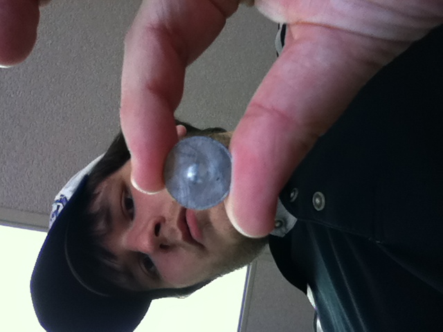 To repeat what gbroke said "It appears to be some dude holding a damaged (grinded) cent above a camera." If you don't like "ground" would you prefer "machined"?