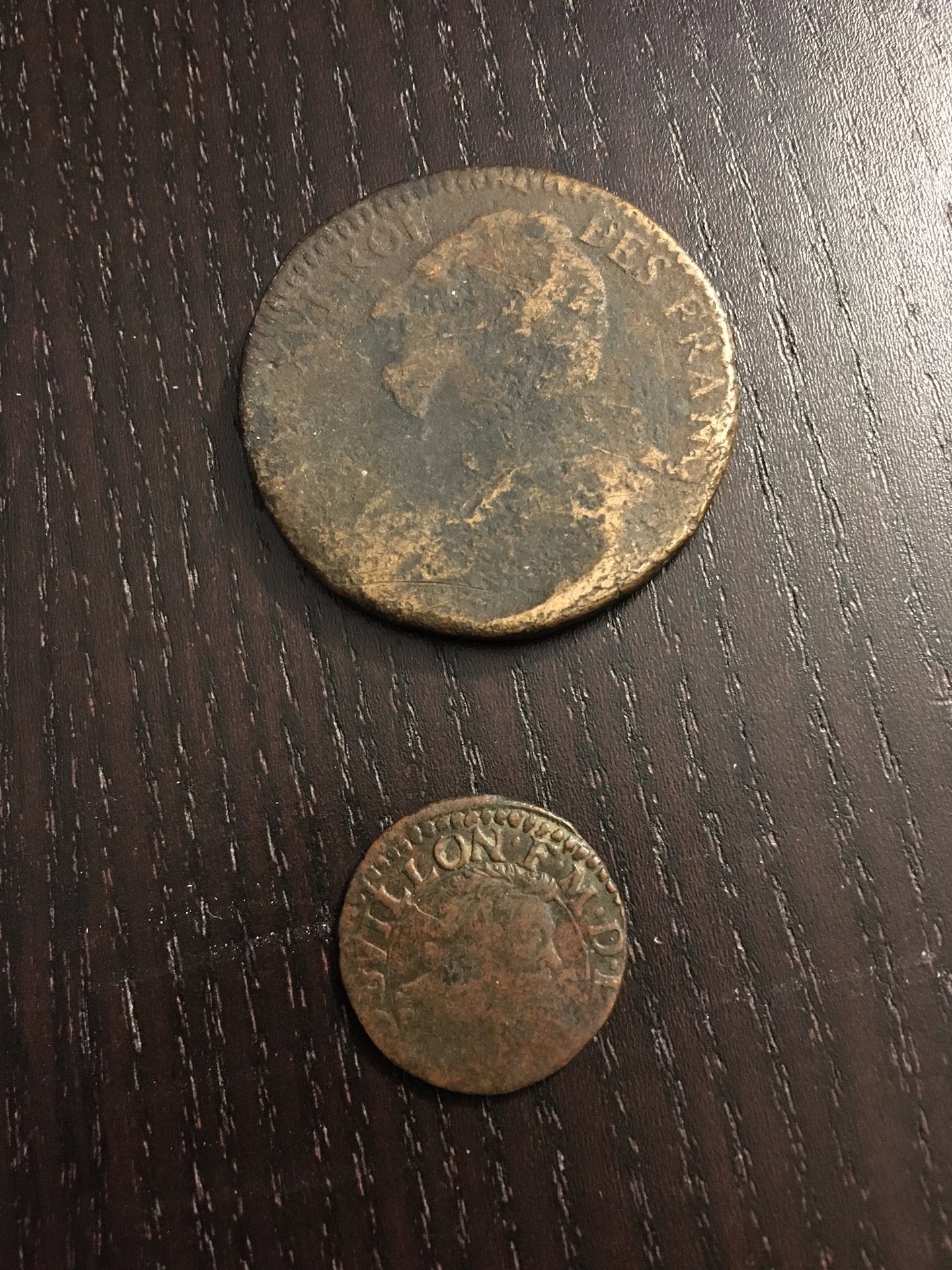 The top coin appears to be a French 2 Sols coin. A rough diameter measurement would help me ascertain the denomination. https://en.numista.com/catalogue/pieces3657.html https://en.numista.com/catalogue/pieces16386.html