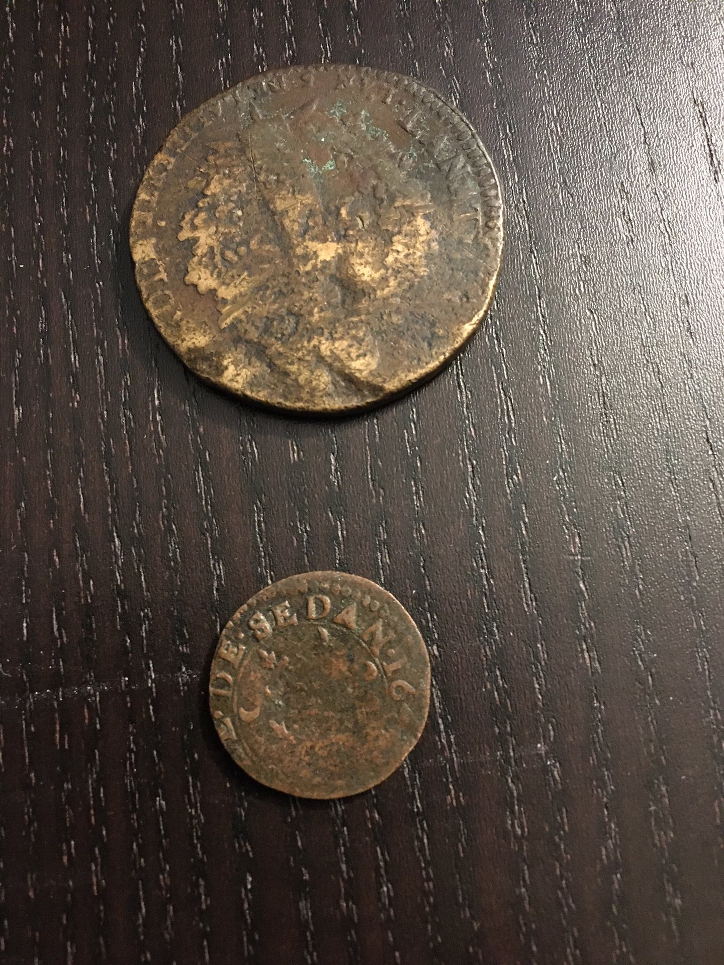 The bottom coin appears to be from the Principality of Sedan. However, I cannot narrow down a date due to the absence of the last digit. https://en.numista.com/catalogue/pieces54057.html