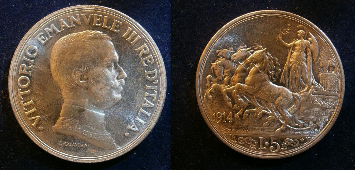 1914 Italian 5 Lira with Victor Emmanuel III in uniform, KM #56 . 25 g of Ag 900, 273,000 struck, but my Standard Catalog (37th Edition, 2009) says a fine example is worth $5000. $15 worth of silver, not quite 100 years old, why should this coin be so expensive?
