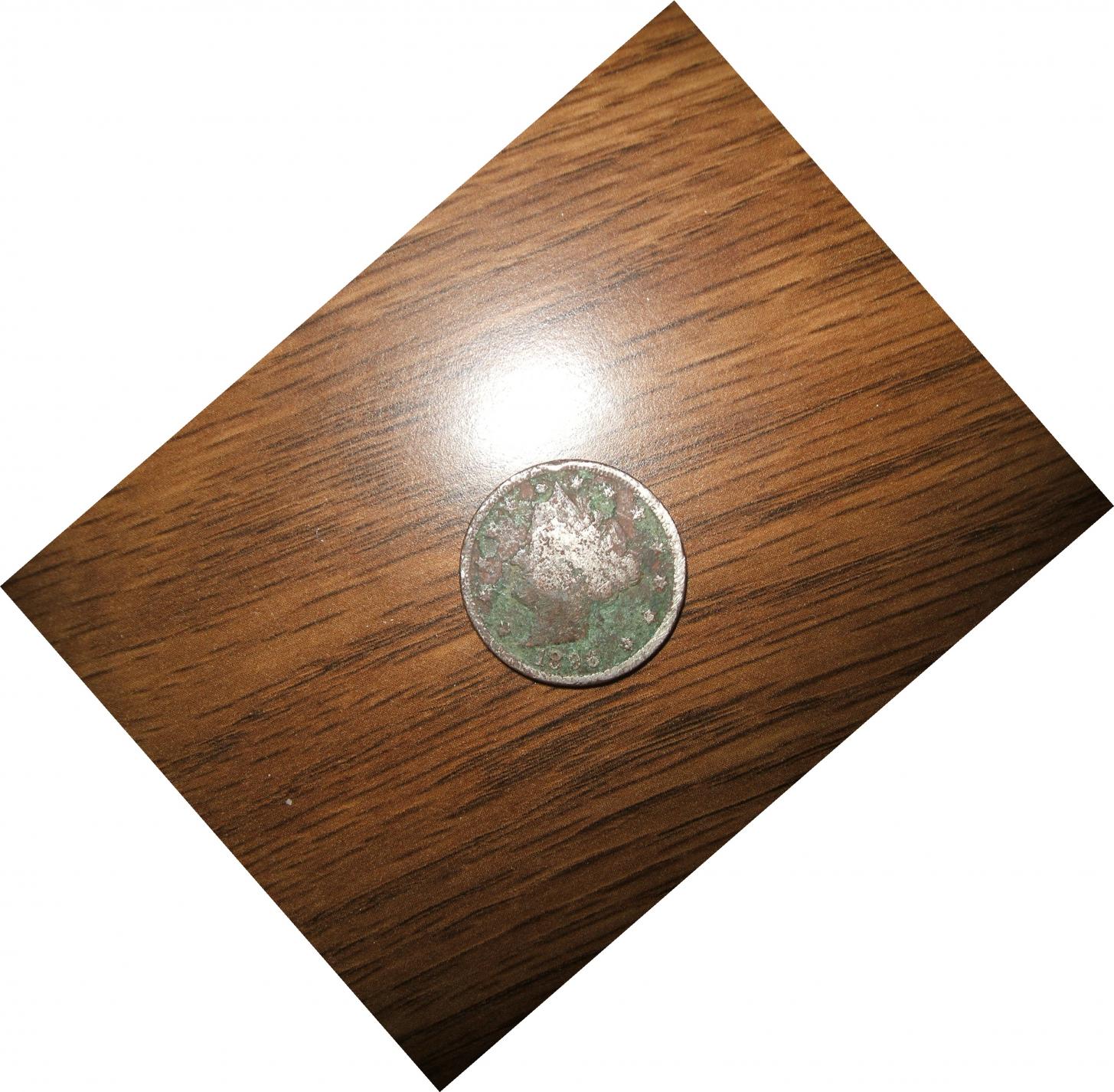 Since the image is called "1886 V Nickel-Obv.jpg", i would guess it is indeed a V nickel and it was minted in 1886. In G-4 said to be worth $230, but this one is truly destroyed, not sure anyone will pay $30 for it.