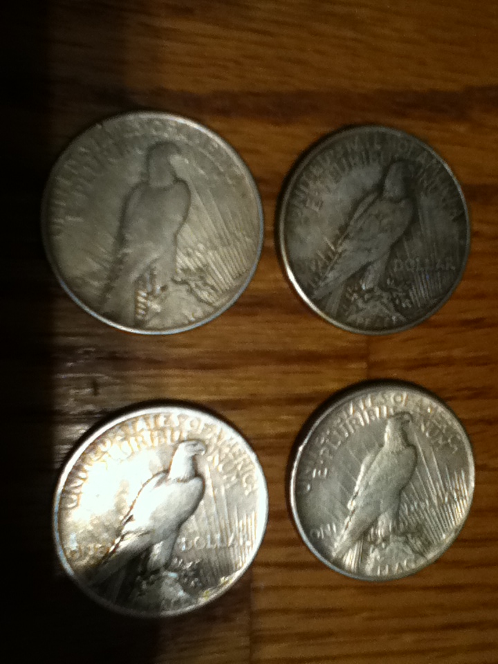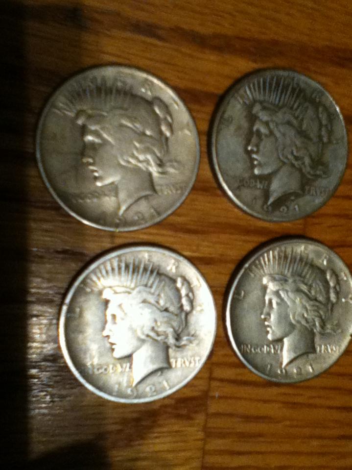 I have 4 1921 Peace dollars. I was fooled by one until I got home and tested it with Metal detector. Can you tell which one is the fake? If so, how did you know? Educate us all. I actually got two fakes that day and they offered to replace them, I replaced the Morgan but decided to keep the Peace Dollar. It actually read in the low 80's on the detector, so it may have some silver, but it should have read +90. The Fake Morgan thumped in the nickel range. Which one is fake? Hopefully my pictures are enough for you to tell.