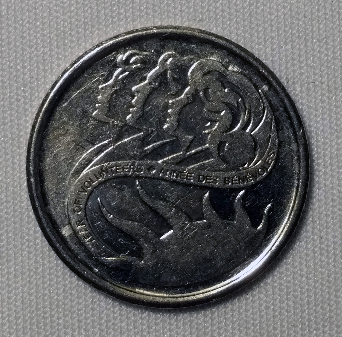The 10 cent coin looks like it has been harshly cleaned, and or received some post mint damage with all the scratches on it. It was a coin to commemorate volunteers in Canada . Value 10 cents.