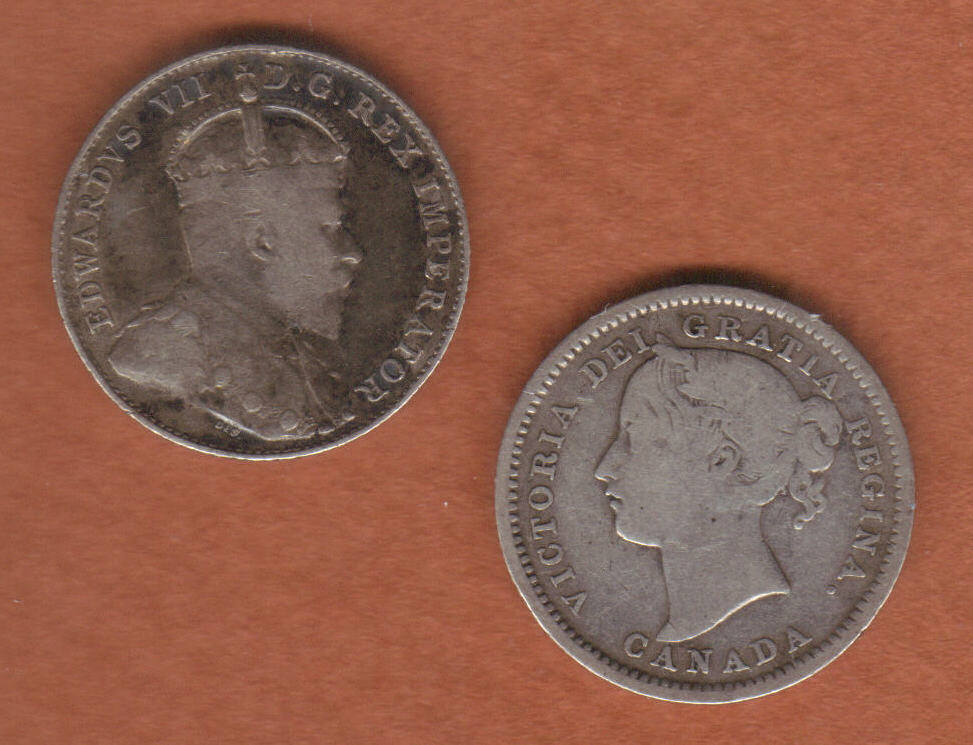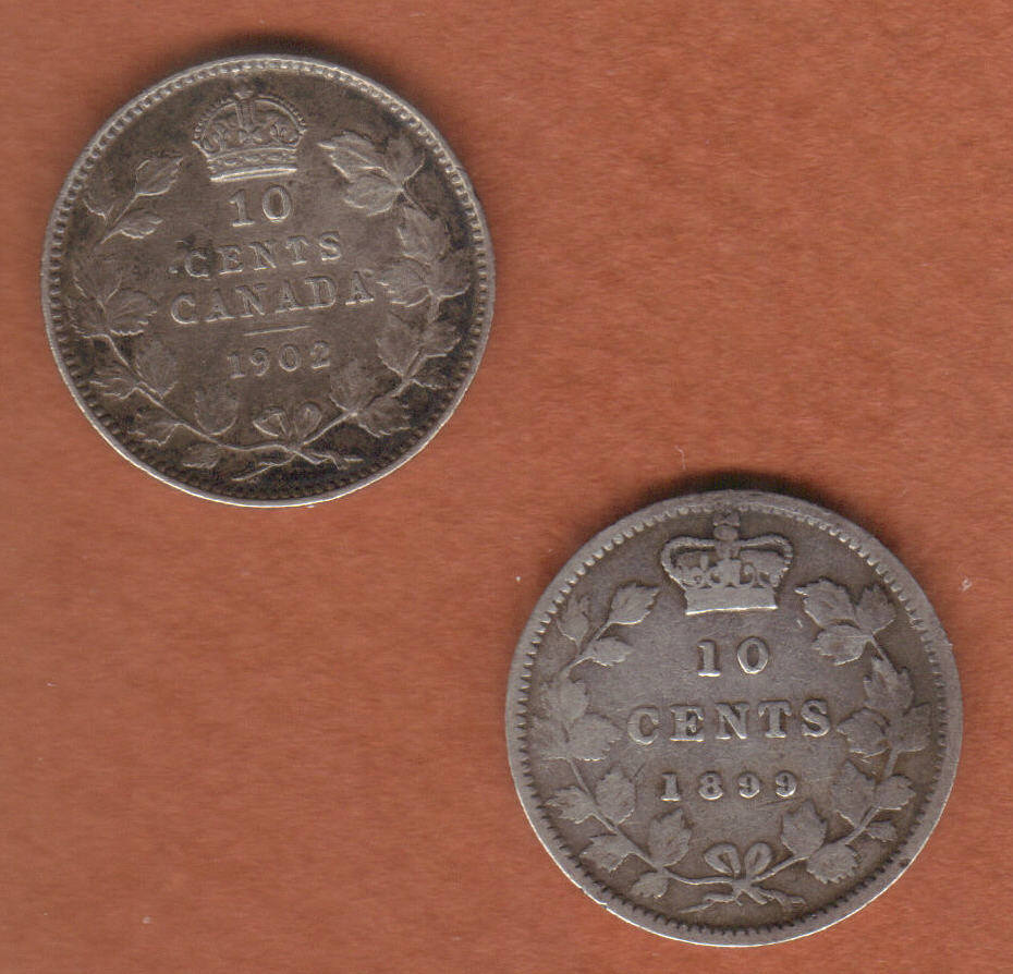 For sale, 1899 and 1902 Canada dimes, as shown. Price US $18. Note, this is NOT the more common 1902-H. Shipped to U.S., free postage, payment by PayPal or money order. Shipped to Canada or other foreign country, add US $1.00 postage, payment by PayPal only; no cash please. No defects noted, no scratches or gouges, no dents, not bent.