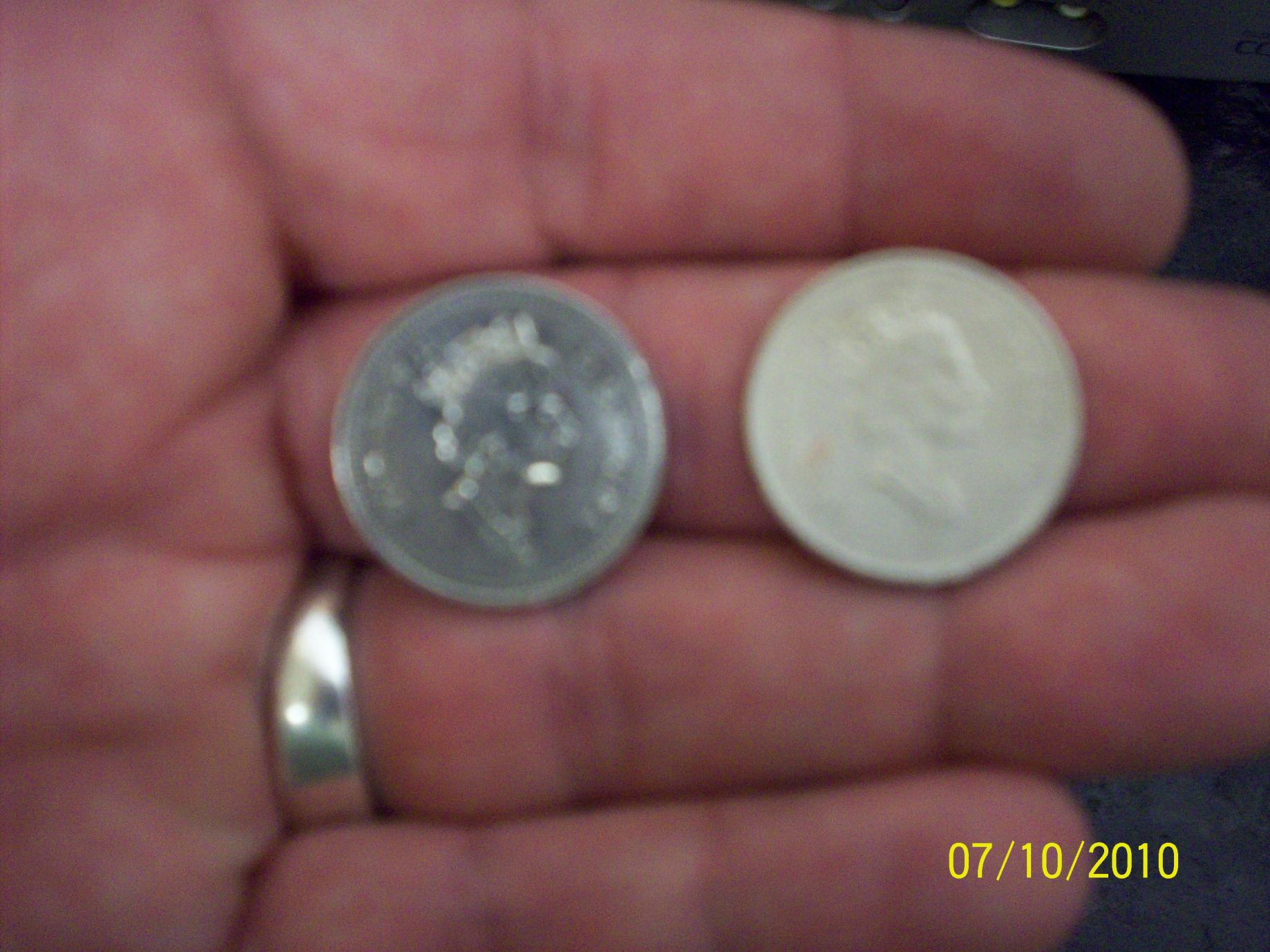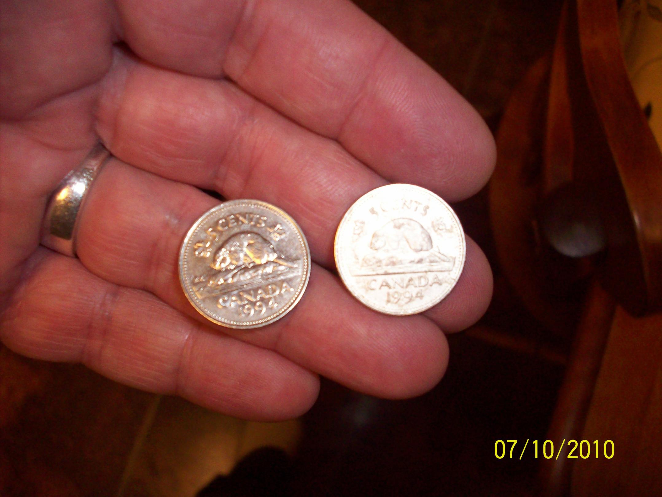 i was organizing years of my canada 5 cent pieces tonight and from today i got a few rolls at the store to go through. i came across a 1994 canada 5cent piece that looks like a whitey silver frost color. i thought it might have been just a stain but its all the coin. so i just washed it in warm water. with a little soap and no color change i compared it with all the coins from that year about 18 diff 5 cent pieces. its really different. so heres a couple of comparison pics, if anyone know what it is please let me know thanks, or opinions..is it a dye issue?
