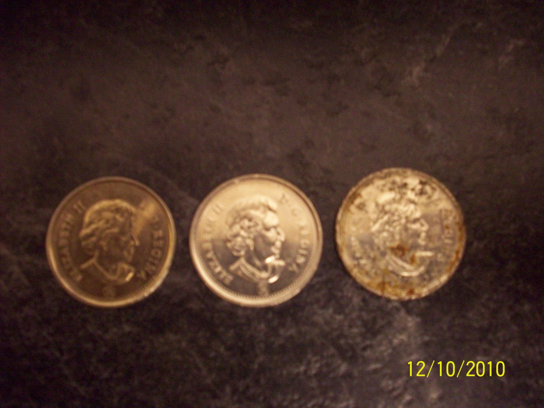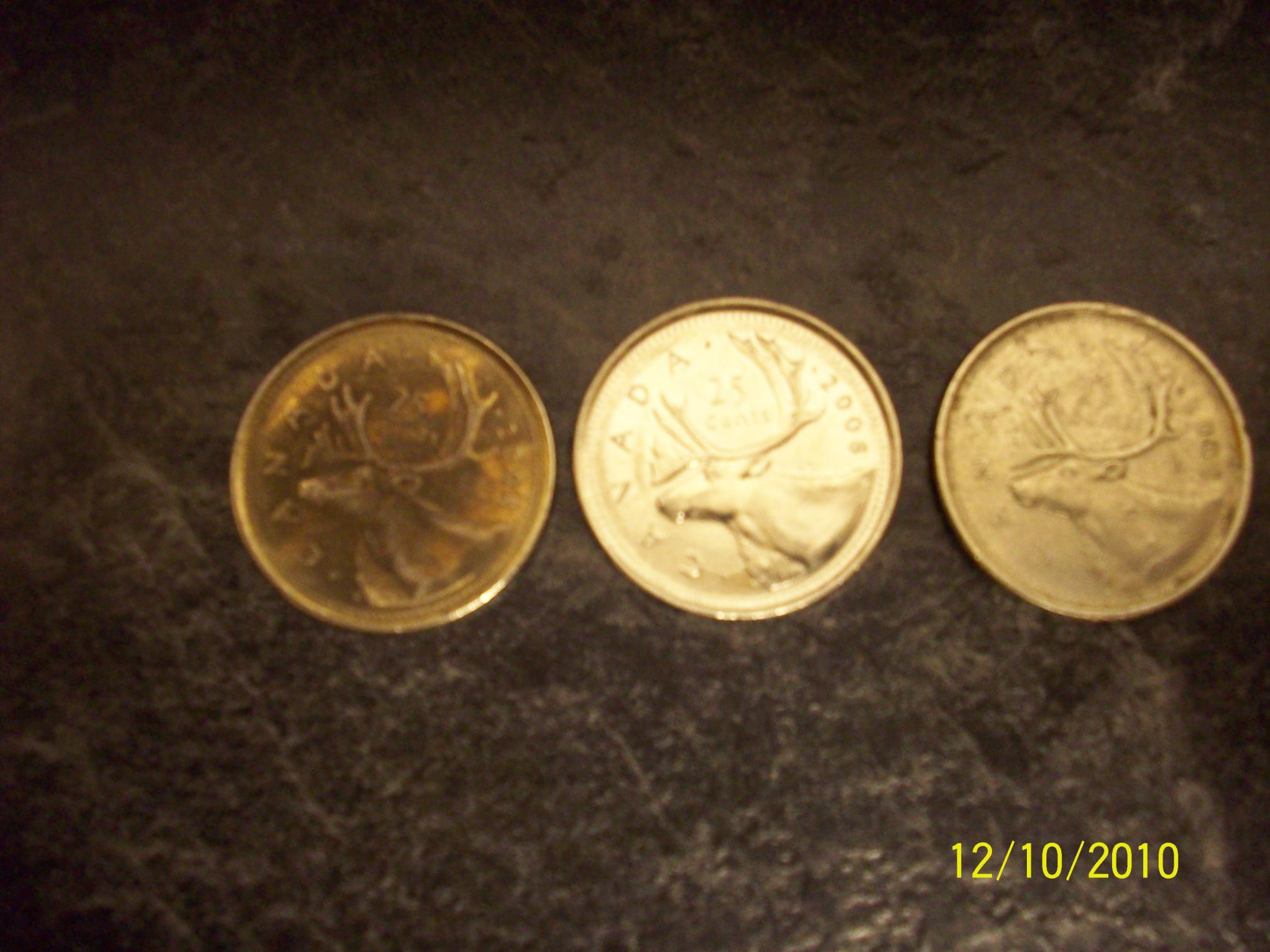 2008 canadian 25 cent oh the middle one is the normal,, of coarse hey lol, i know some people just answer with "post damage "but if theres various metal differences id like to know, any info appriciated