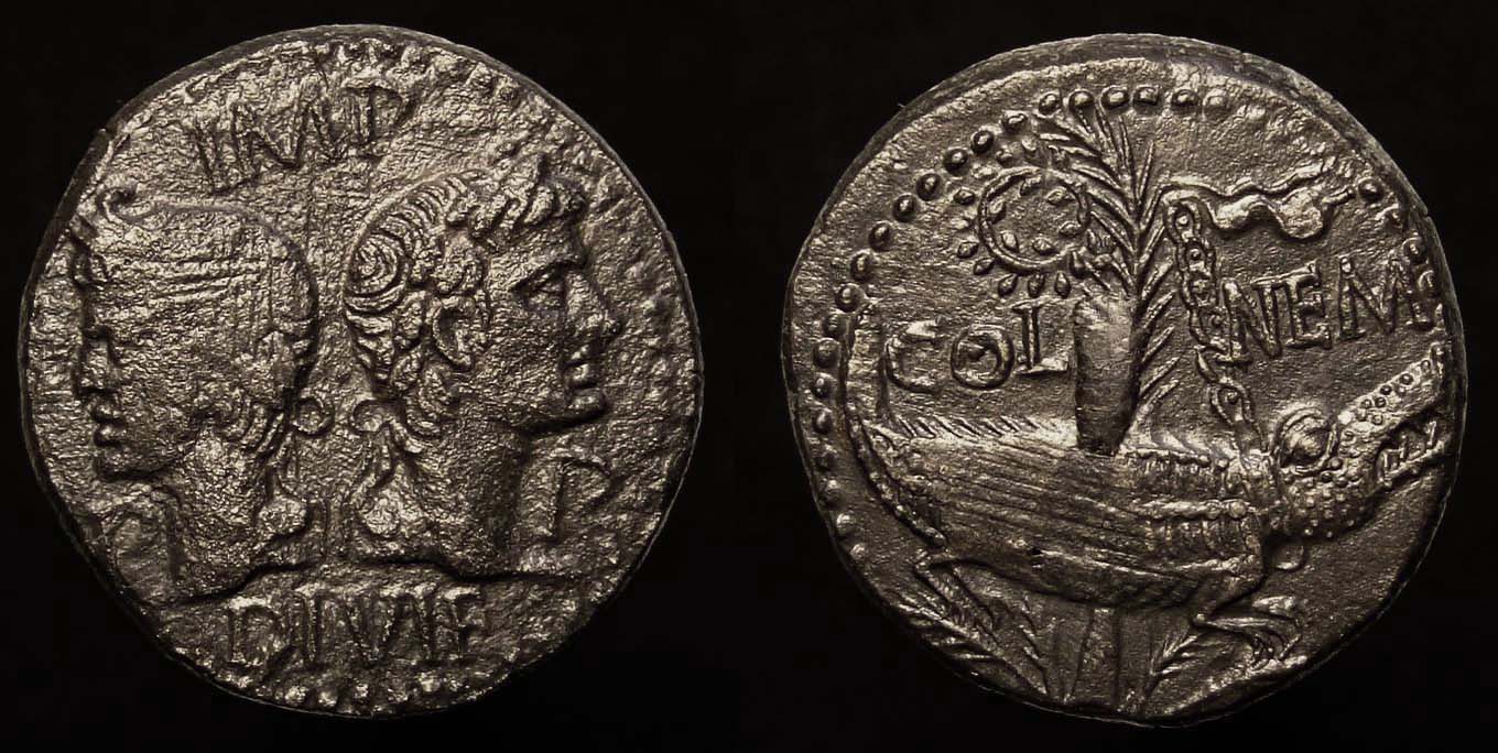 "Dammit, you mean this town isn't called NIM-ausus?!" AUGUSTUS & AGRIPPA AE As. 12.0g, 26.4mm. GAUL, Nemausus, circa 20-10 BC. RIC I 156. O: IMP/DIVI•F•, head of Agrippa left, wearing combined rostral crown and laurel wreath, bare head of Augustus right. R: COL-NIM, crocodile right chained to palm branch, wreath above, palm fronds below.