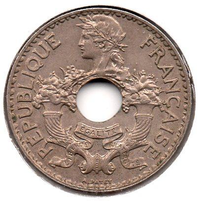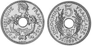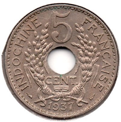 Ok. So what's the deal here? Krause has the French Indo-China coins listed as "Cents" The coin itself has "Cent." And the French generally use "Centimes." So is it "Cents" or "Centimes"? From Krause Standard Catalogue of World Coins 1901-2000, 2010 Edition MONETARY SYSTEM 5 Sapeques = 1 Cent 100 Cents = 1 Piastre KM# 18 5 CENTS 5.0000 g., Copper-Nickel, 24 mm. Obv: Cornucopias flank center hole, laureate head left above Rev: Center hole within wreath divides denomination, date below Note: 1.6 mm thick; prev. KM#18.1 Date Mintage F VF XF Unc BU 1923(a) 1,611,000 5.00 10.00 20.00 40.00 — 1924(a) 3,389,000 6.00 12.00 24.00 45.00 — 1925(a) 6,000,000 5.00 10.00 20.00 35.00 — 1930(a) Torch 4,000,000 5.00 10.00 20.00 35.00 — 1937(a) Wing 10,000,000 2.00 5.00 10.00 20.00 — 1938(a) 1,480,000 15.00 30.00 75.00 160 — 1938(a) Proof — Value: 275 And here's mine: