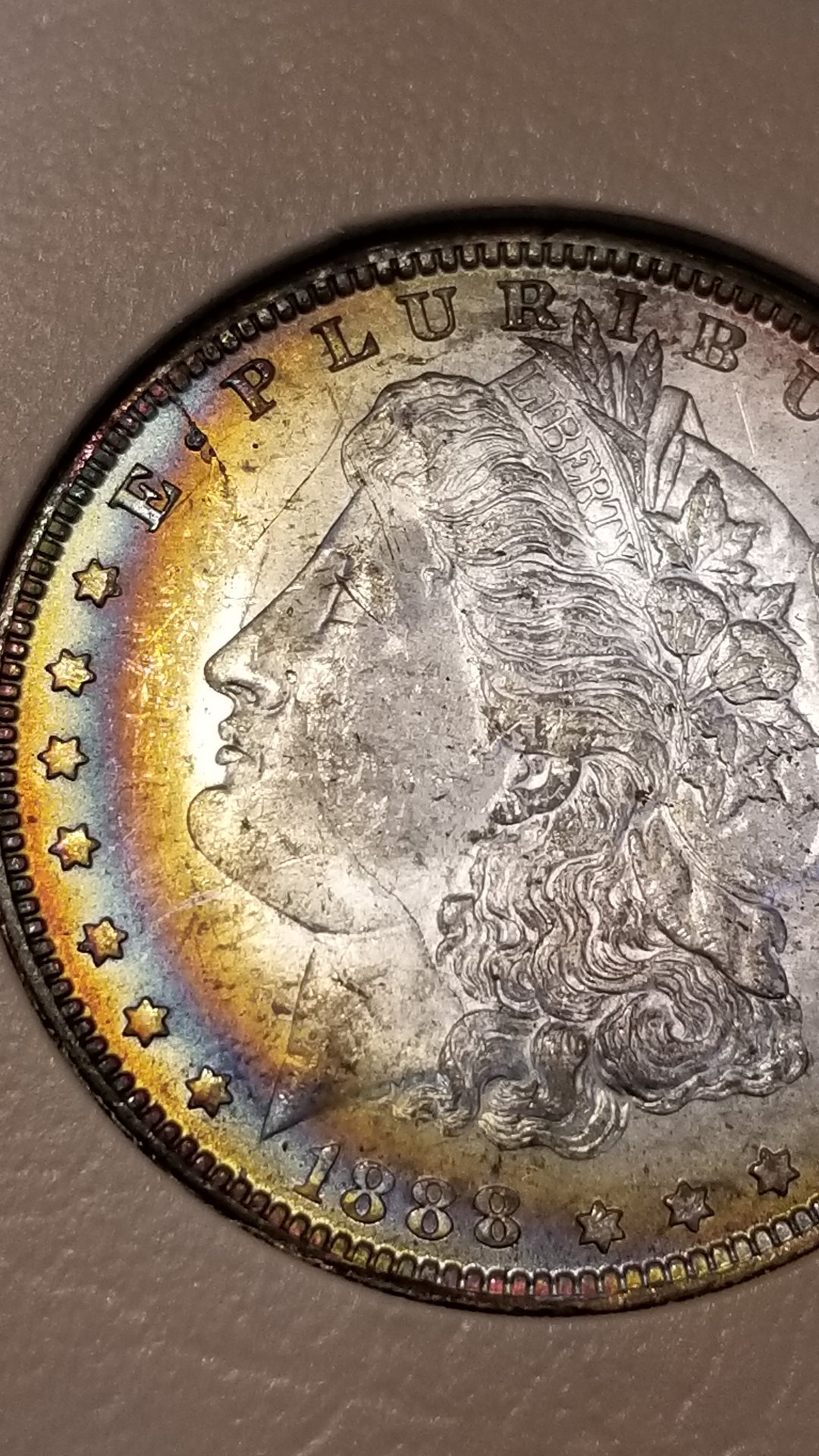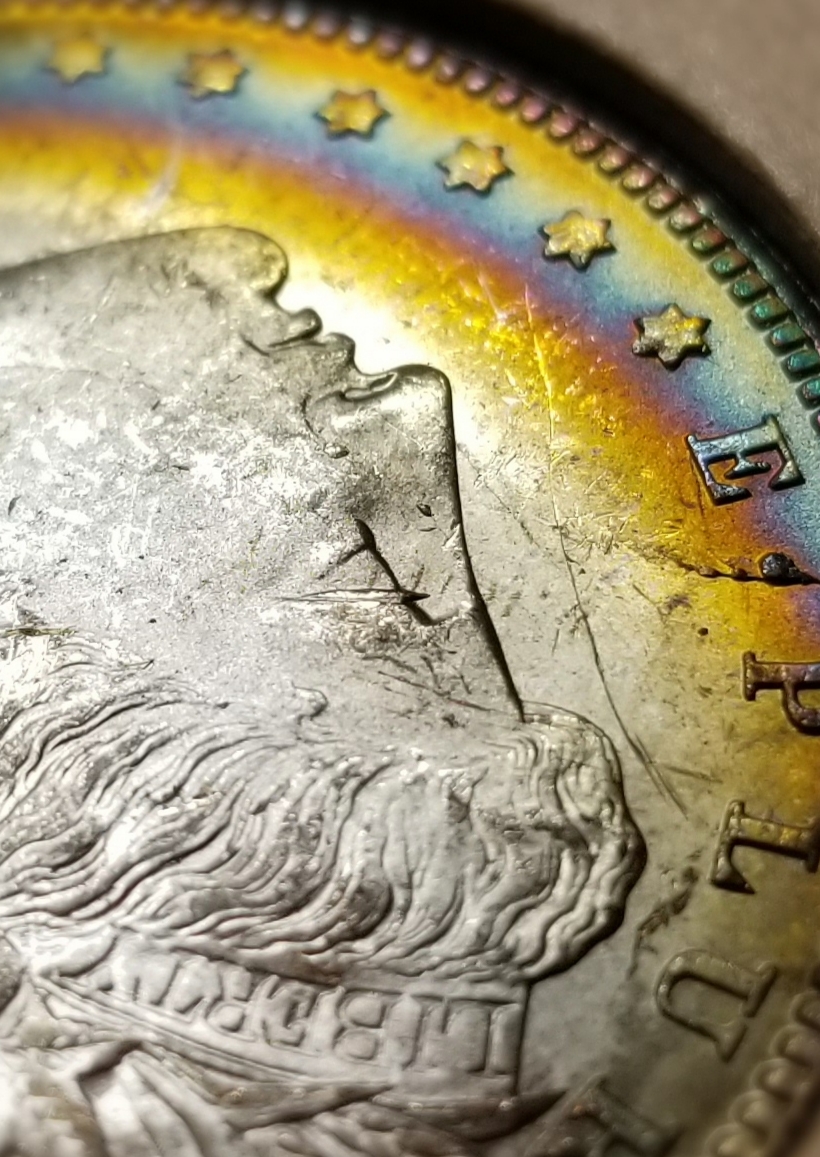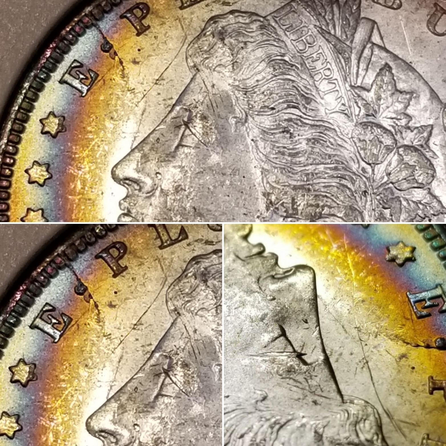 That's a very rare (in that grade especially) VAM It is NOT damaged - have it certified/graded, and you'll be surprised what it's worth. I don't know the VAM # off-hand, but it's called the Scarface Varieity - rare rare in that grade. (I don't like the color 'ring' on the reverse)
