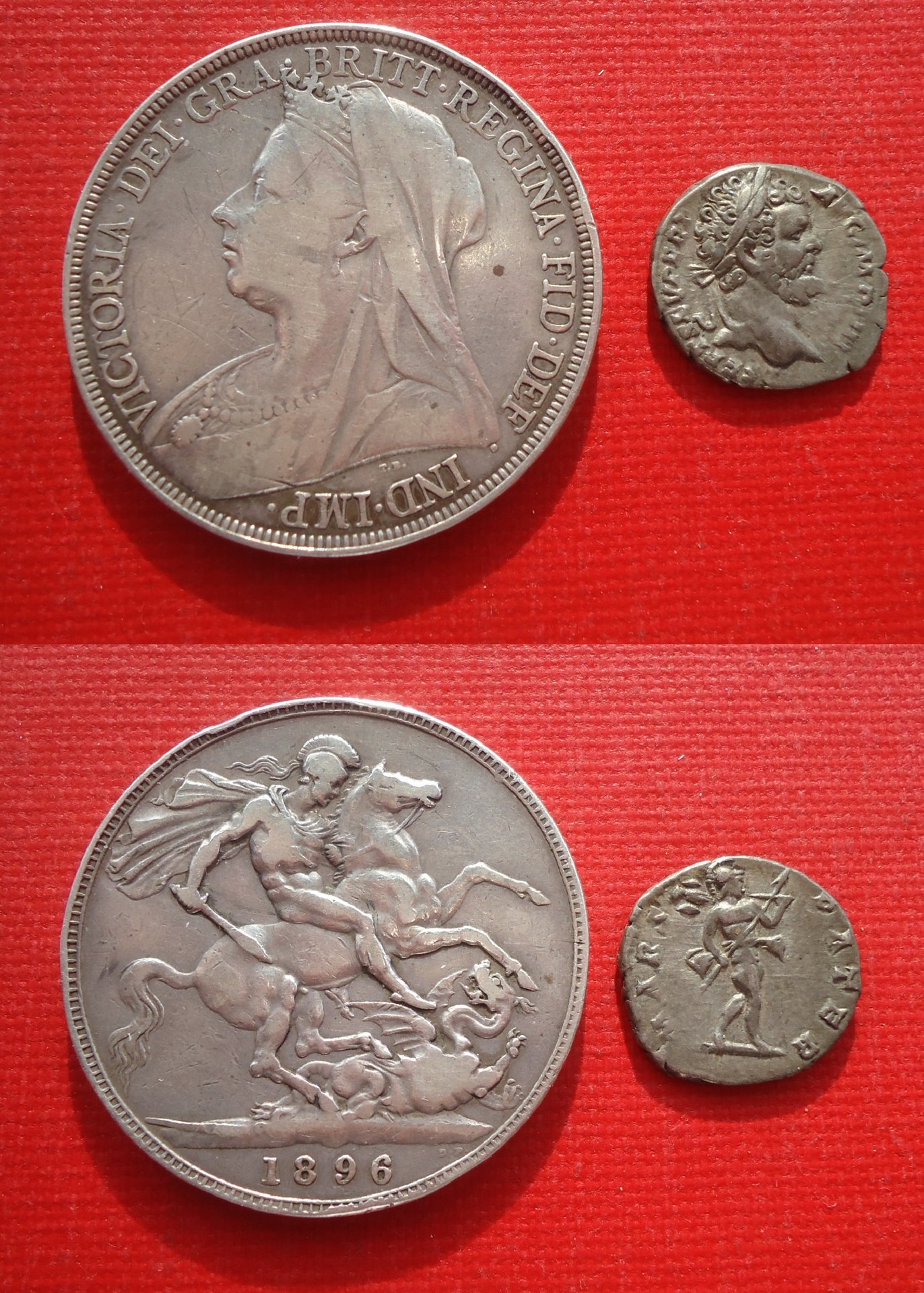 Your post is making me nostalgic, jamesicus. To add an ancient dimension to the UK crowns, I decided to photograph two of the first coins I ever bought when I became semi-serious about coin collecting. One is a denarius of Septimius Severus with MARS PATER reverse (RIC 46). The other is a rather scruffy Great Britain crown of 1896, Queen Victoria veiled portrait and St. George & the dragon reverse. Both of these coins flipped some neuro-chemical switch in my head that I think most collectors have. I couldn't believe how beautiful they were, and how old (I use "old" loosely - in 1987 when I bought them, the crown wasn't even a centenarian yet!). I also couldn't believe how massive that crown was. For 30+ years these two coins have been the start of my obsession with old coins. For years I'd work on ancients, then back to World crowns and minors. Looking back on it, I wish I'd devoted more time and money to the ancients - there is more to them historically and artistically and they tend to compel me to read more books. As you mention, CT has been a real spur to expand my horizons as well as my collection (and meet some nice folks to boot). With world crowns I used to tend to accumulate rather than collect - teetering piles of dinged-up crowns - a bit sterile as a collection, I think. But some world coins, including this crown, are really spectacular too. Anyway, here they are, 1987 purchases, pre eBay. The Septimius Severus denarius cost me about $35 as I recall - it appears to be one of SS's scarcer reverse types, at least I haven't encountered many of them over the past 2 years or so. The crown was $12.00 from a coin shop in Columbus, Ohio. Not sure that they've appreciated enough to call them "investments" but they still bring me pleasure.
