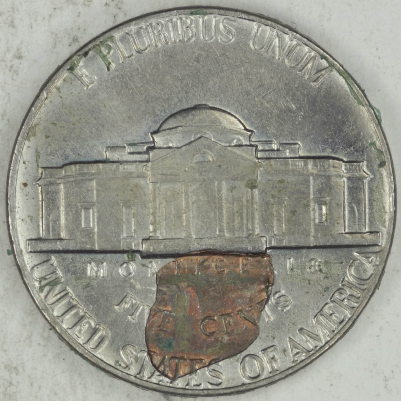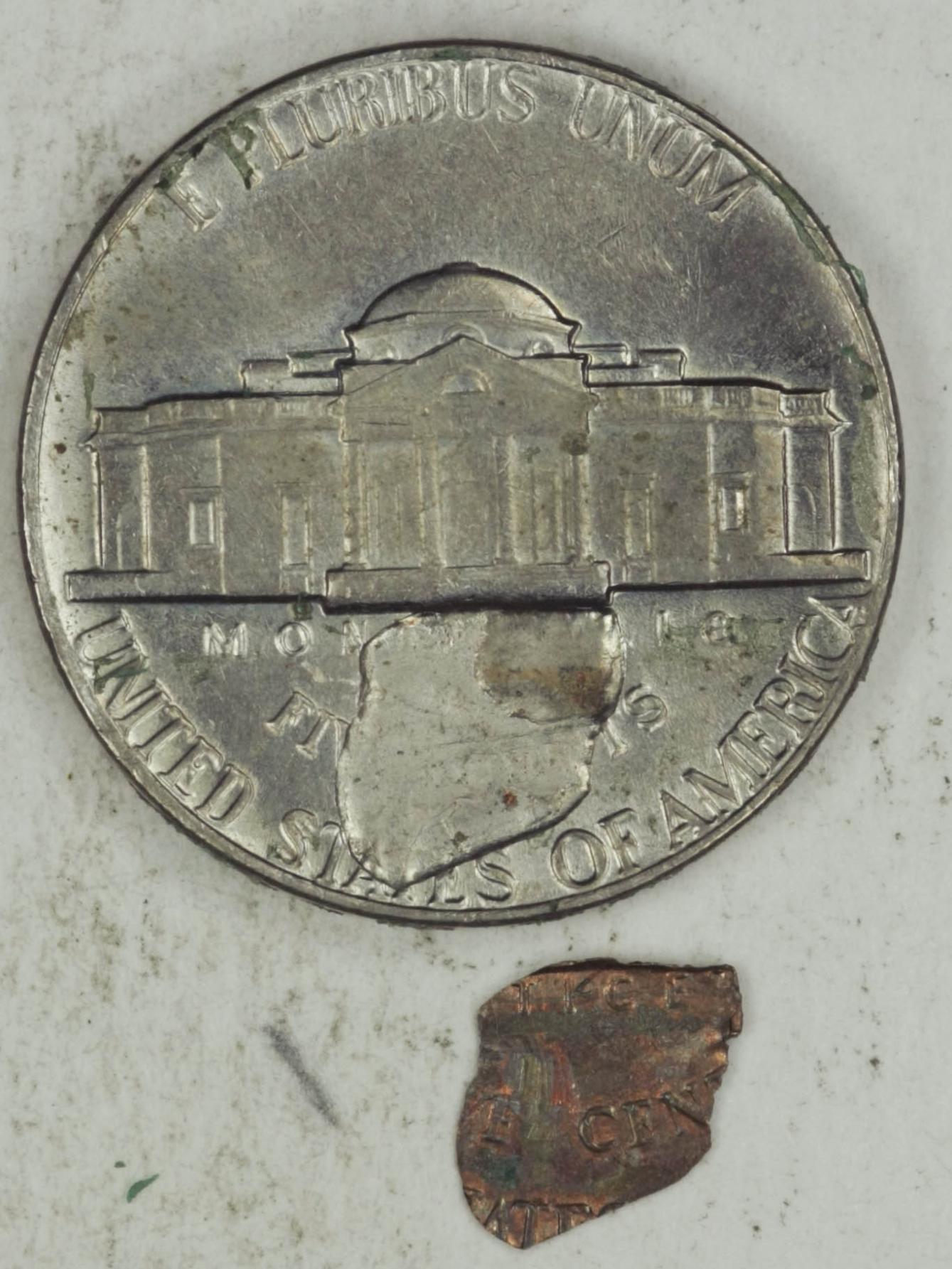 I had a customer walk in with this piece this morning. These are SUPER hard to find like this. It looks like these pieces were bonded at first and then over time have separated. I have both pieces. This is a retained struck through fragment. The struck copper fragment is scarce but the 2 pieces together is very rare. I am in the process of removing the tape residue that was holding it in place when I bought it and you can see in the pics. I wanted to share. Enjoy