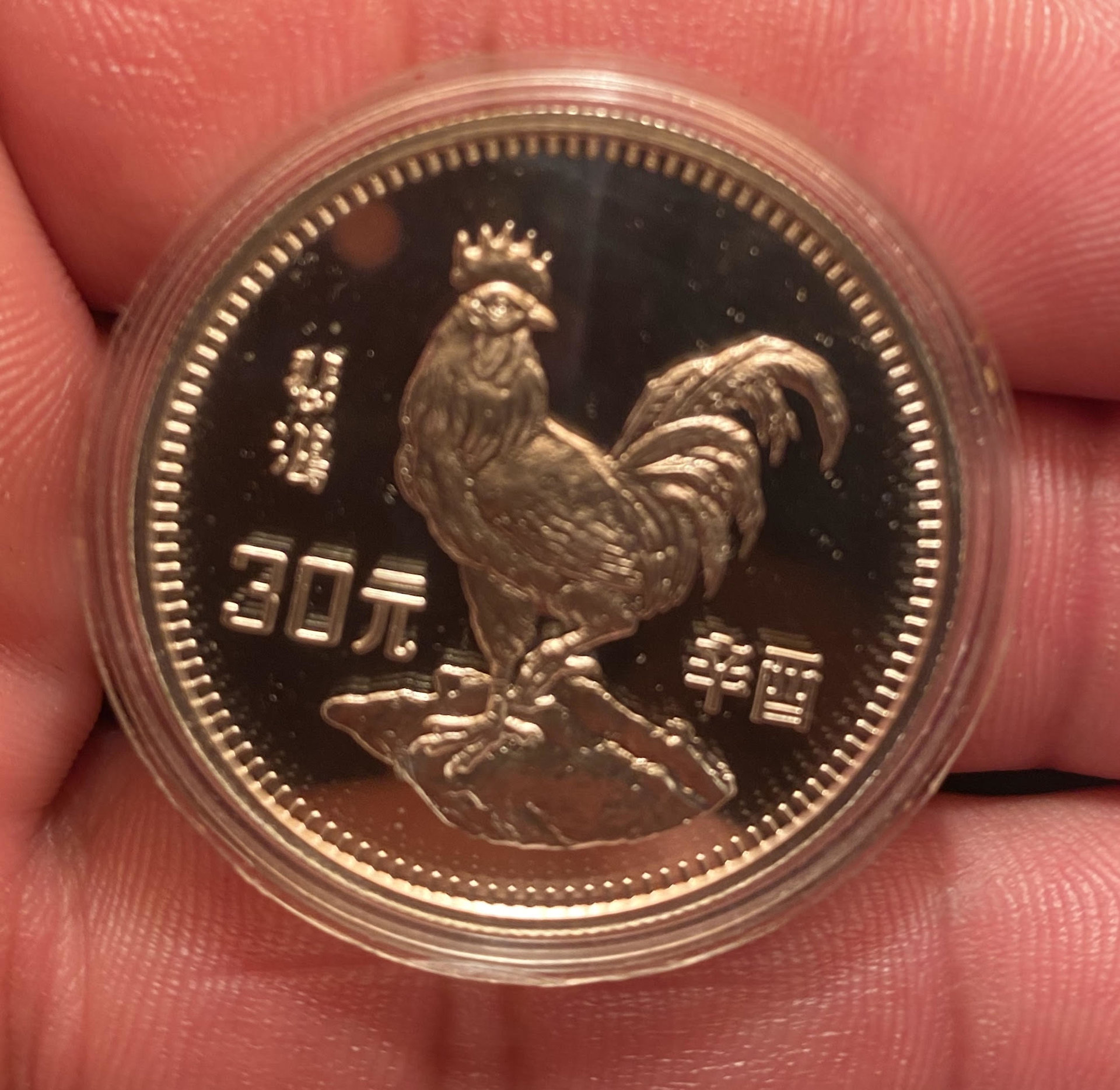 People's Republic Year of the Rooster Proof 30 Yuan 1981 15 gram silver Rooster is the first coin in a 12-year cycle of silver Lunar coins that runs from 1981 to 1992. It is also the very first Chinese silver Lunar coin of the modern era. It was released in January of 1981 before the start of the Lunar New Year holiday. Mintage: 10,000