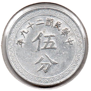 China (Mainland Republic) - 1 Cent - 1940 - Aluminum China (Mainland Republic) - 5 Cents - 1936 - Nickel